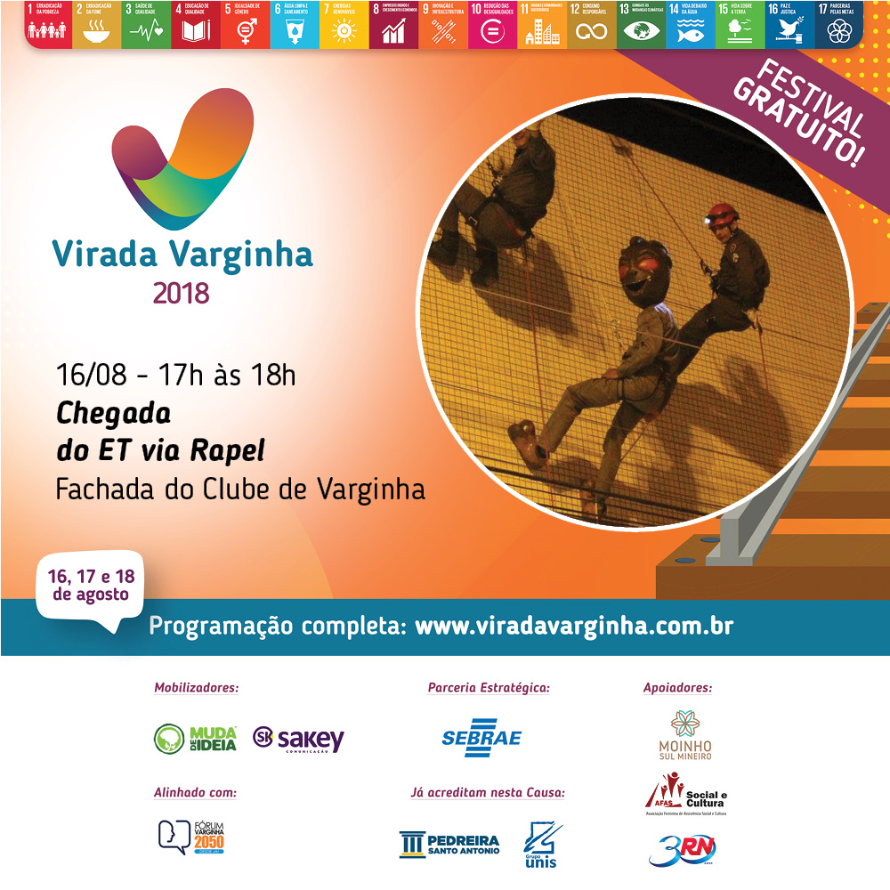Descendo de rapel desde a fachada do Clube, o ET de Varginha se junta a um cortejo mobilizado pelo grupo de palhaços Doutores Anjos da Alegria que se juntarão a quem desejar participar do trajeto até a Praça da Estação Ferroviária para a Abertura (entrada livre) do festival. Os Bombeiros Militares e a empresa de limpeza de fachadas Verticalize auxiliarão, zelando pela segurança da operação.